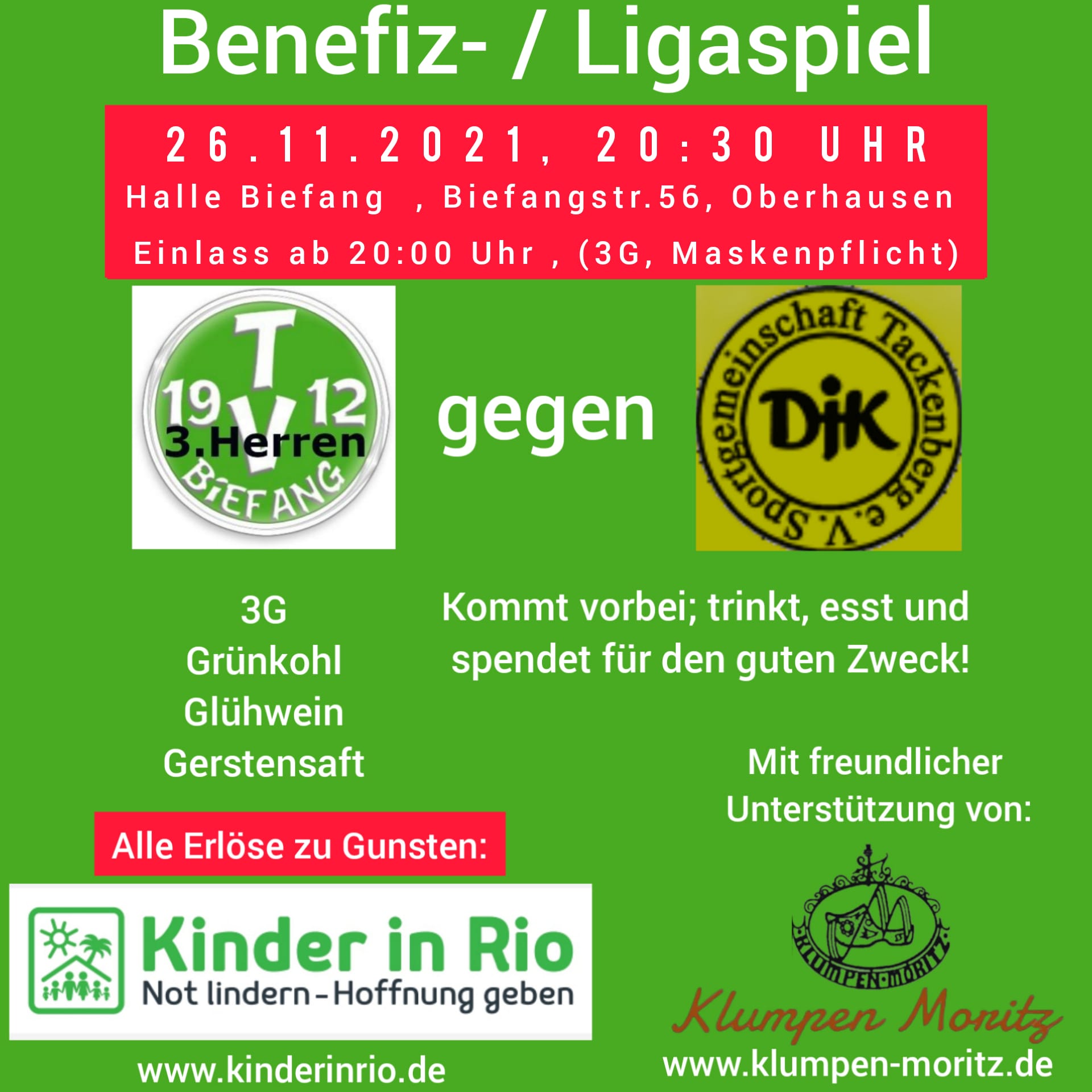Herzliche Einladung zur Heimspielpremiere des TV Biefang, der in dieser Saison erstmalig mit der neuen Trikotwerbung für KINDER IN RIO aufläuft. Es gibt lecker Grünkohl, Glühwein und andere gekühlte Getränke, gesponsert durch die Familie Terhorst vom Klumpen Moritz.