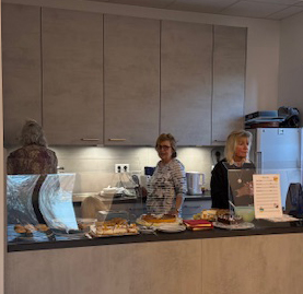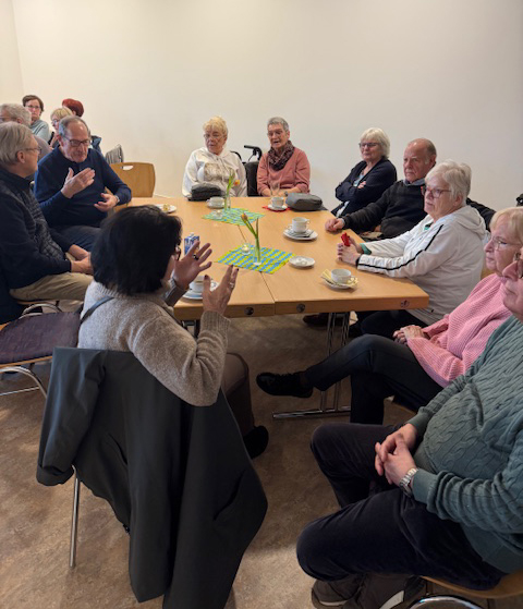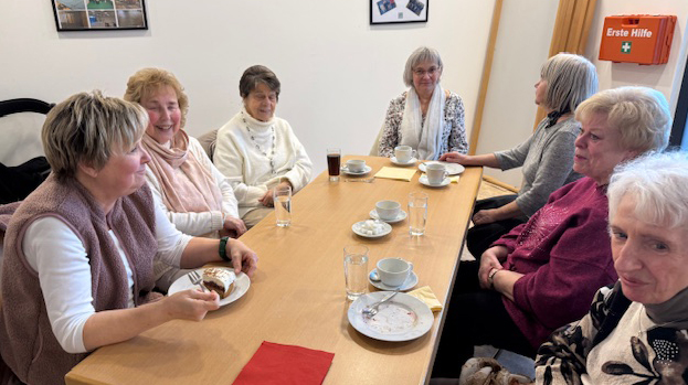 Bereits eine Stunde vor Beginn standen 40 Stühle und die geschmückten Tische bereit. Die Rückenschulungsgruppe von Klaudia Messer hatte die Ausrichtung und Bewirtung übernommen. Alle Kuchen wurden natürlich selbst hergestellt und der Kaffee gekocht. Dann wurde die Eingangstüre geöffnet und die Besucher kamen. Da reichten die Stühle nicht mehr aus und es mussten schnell weitere Tische und Sitzplätze her. In gemütlicher Atmosphäre wurde dann geplaudert und alle Kuchen verspeist.