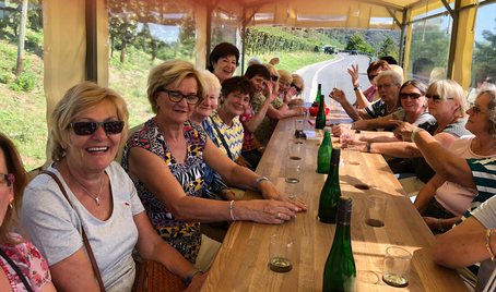 Eine Planwagenfahrt mit dem Trecker durch die Weinberge! Der Anblick von oben ins Moseltal war fantastisch. Wir haben es genossen und unsere lautstarken Gesänge klingen noch heute in Cochem nach!! Es konnte uns nicht besser gehen.