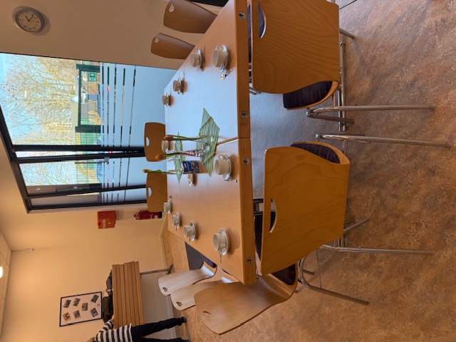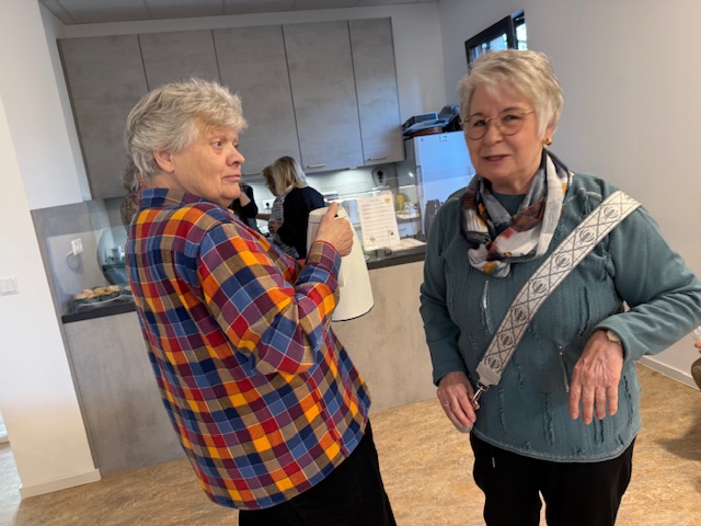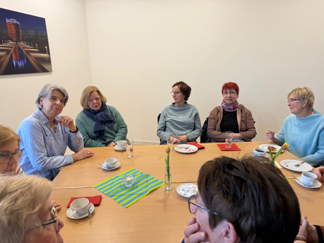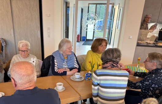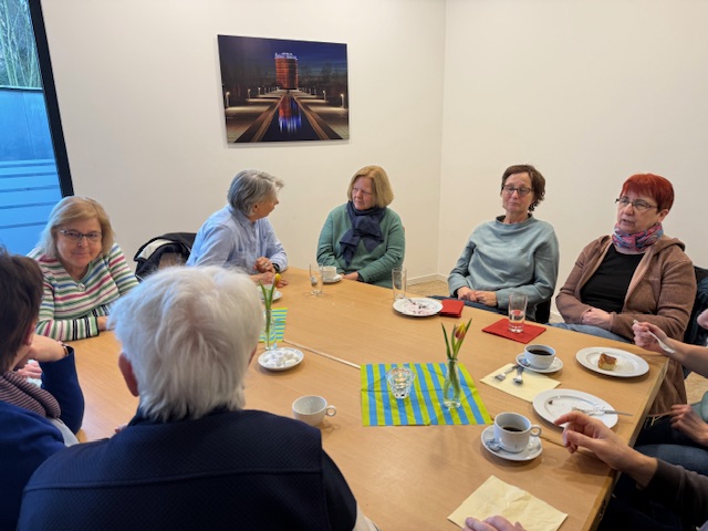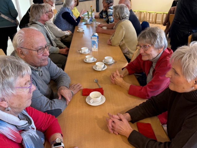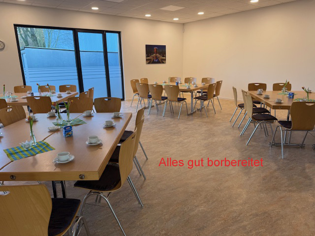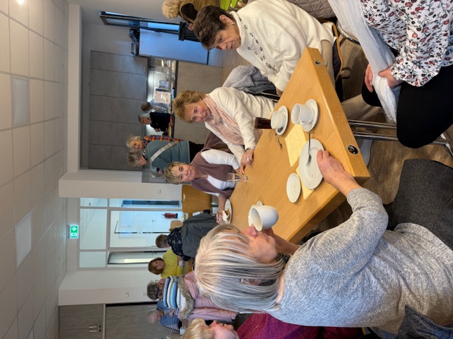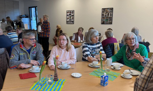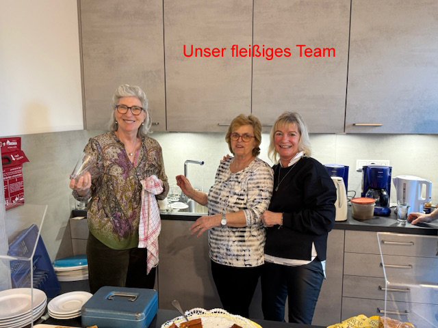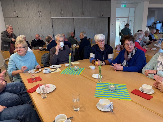 Bereits eine Stunde vor Beginn standen 40 Stühle und die geschmückten Tische bereit. Die Rückenschulungsgruppe von Klaudia Messer hatte die Ausrichtung und Bewirtung übernommen. Alle Kuchen wurden natürlich selbst hergestellt und der Kaffee gekocht. Dann wurde die Eingangstüre geöffnet und die Besucher kamen. Da reichten die Stühle nicht mehr aus und es mussten schnell weitere Tische und Sitzplätze her. In gemütlicher Atmosphäre wurde dann geplaudert und alle Kuchen verspeist.