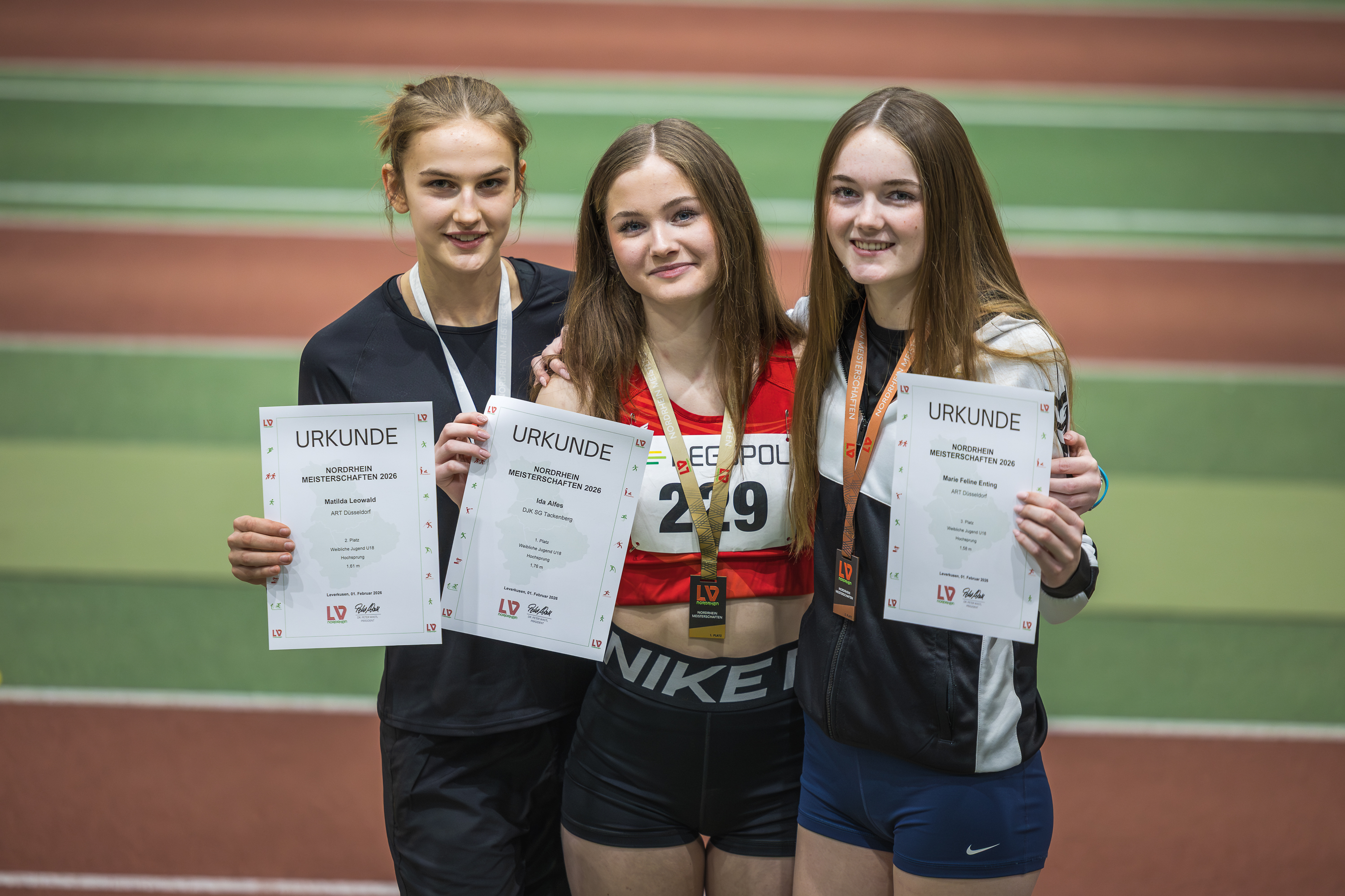 Nachdem Ida Alfes von der DJK SG Tackenberg schon bei den Regionsmeisterschaften Mitte Januar mit überquerten 1,73m gut in die Hallensaison gestartet ist, ging es am letzten Januartag zu den Nordrheinmeisterschaften U18/U20/Männer/Frauen in die Leverkusener Fritz Jacobi Halle. Wie gewohnt ging Ida (trotz leichter Erkältung) sehr konzentriert und fokussiert an den Start. Ihre Einstiegshöhe von 1,55m absolvierte sie im ersten Versuch und ließ auch bei den folgenden Steigerungen um 3cm zunächst nichts anbrennen. Erst bei 1,67m patzte sie zweimal, konnte dann aber im dritten Versuch die Höhe wieder gewohnt locker nehmen. 1,70m gelangen dann im ersten und 1,73m wieder im dritten Versuch. Nach kurzer Analyse und Beratung mit ihrem Trainer (Ralf Ruhrmann) schaffte sie dann aber auch die aufgelegten 1,76m bravourös im ersten Versuch und steigerte damit ihre PB um zwei Zentimeter. Die folgenden 1,79m waren dann an diesem Tag etwas zu viel des Guten, wenngleich Ida vor allem bei ihrem zweiten Versuch gezeigt hat, dass sie das Potenzial für diese Höhe hat. Den Titel der „Nordrheinmeisterin U18 Halle“ für das Jahr 2026 kann sie verdient für sich verbuchen. Am 22. Februar steht dann mit den Deutschen U20-Hallenmeisterschaften der letzte Indoorwettkampf an. Die Bundeskaderathletin startet (hochgemeldet) in Sindelfingen; die Qualihöhe von 1,71m hat sie nun mehrfach überquert.