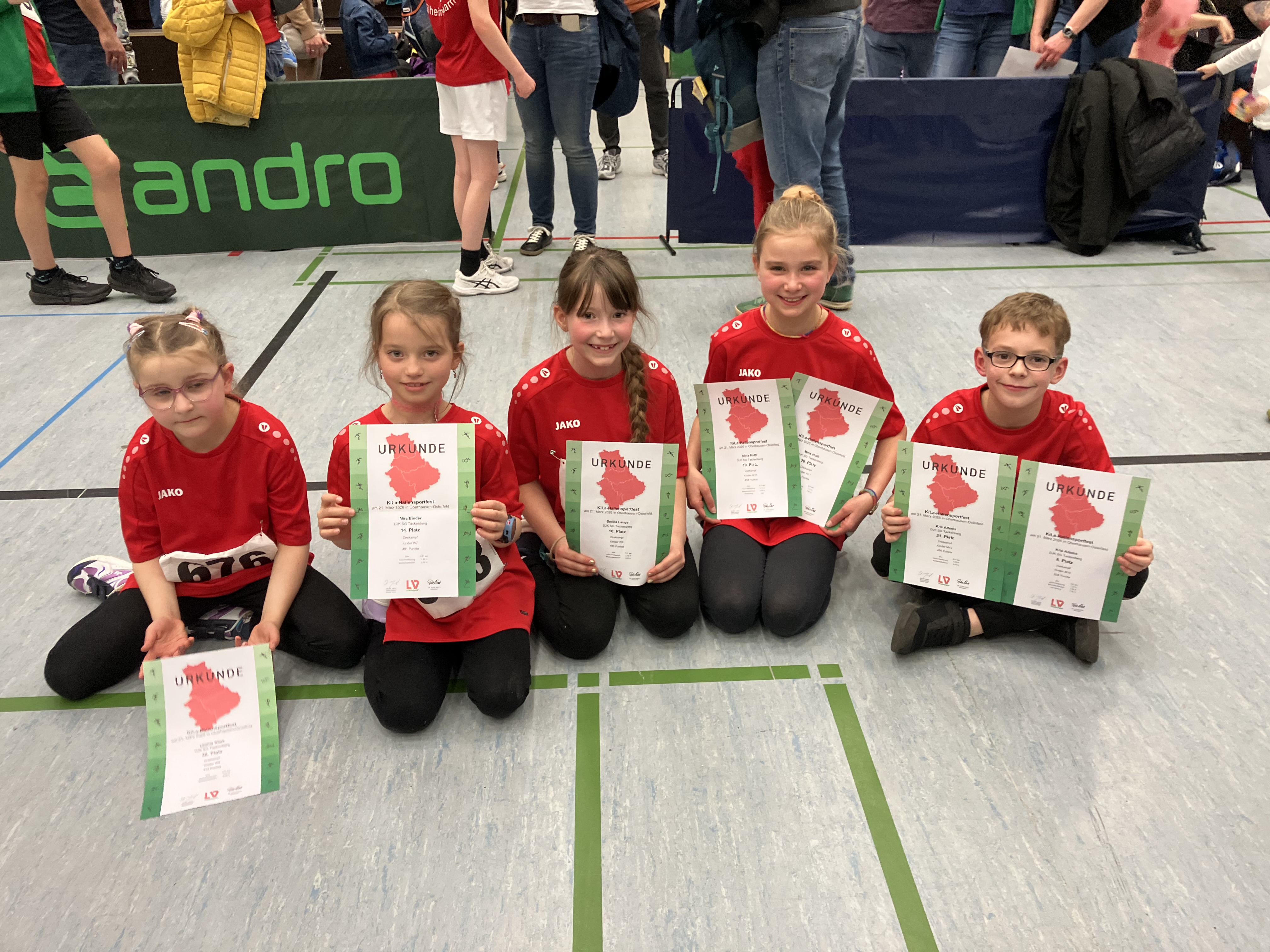 Mit sieben Kindern der U8, U10 und U12 war die DJK SG Tackenberg beim Kila-Hallenwettkampf in Oberhausen-Osterfeld vertreten. Neben individuellen Bestmarken sammelten die jungen Leichtathletinnen und -athleten vor allem wertvolle Wettkampferfahrung. Auf dem Programm standen ein Hochweitsprung auf Matten, ein Sprint und der Medizinballstoß für den Dreikampf; die Kinder der U12 absolvierten zusätzlich den Hochsprung und damit einen Vierkampf.