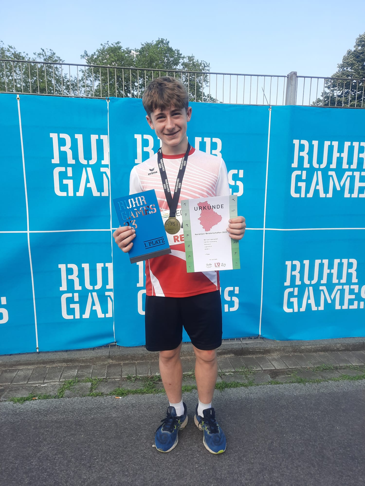 M15-Athlet Ben Lapaczynski hat sich am 10./11. Juni einen vollständigen Medaillensatz erkämpft. Am Samstag konnte er im Landschaftspark Duisburg Nord auf der extra für die Ruhrgames aufgebauten Anlage vor großer Kulisse seinen ersten Stabhochsprung-Wettkampf bestreiten. Trotz großer Nervosität gelang ihm ein beachtlicher Satz über 2,80 m, was Ben den zweiten Platz und die Silbermedaille einbrachte. Danach ging es, bedingt durch die eher ungewöhnliche Kombination von Disziplinen, mit dem Auto so schnell wie möglich in den Sportpark Wedau, wo der Diskuswurf ausgetragen wurde. Bis zum dritten Versuch waren die technischen Ungenauigkeiten beseitigt und der Endkampf der besten acht Athleten erreicht. Hier schleuderte Ben den Diskus direkt mit dem vierten Versuch auf starke 38,88 m, verbesserte seine persönliche Bestmarke um fast drei Meter und setzte sich damit an die Spitze des Feldes. Von dort konnten ihn die anderen Athleten bei den weiteren Durchgängen nicht mehr verdrängen und Ben sich somit die Goldmedaille sichern.